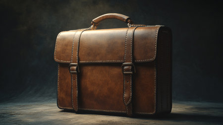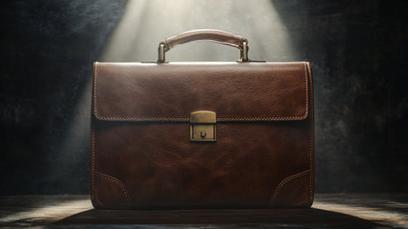 A stylish brown leather briefcase made of soft leather stands on a textured wooden surface in a photo studio. Symbol of successful work in business.