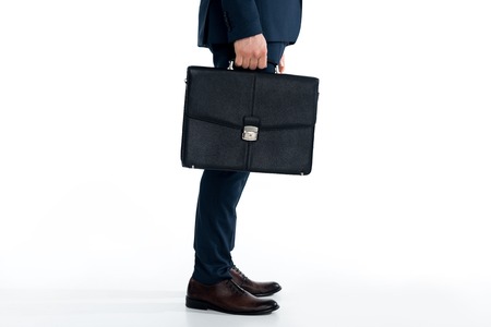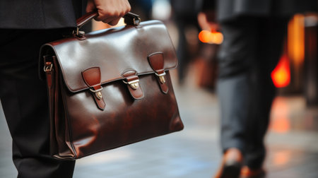Man in suit holding leather bag. Close up shot of businessman in subway holding brown leather case in his hand.