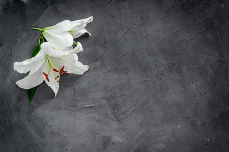 Remembering and mourning with white lilies on dark background Selective focus, close-up, side view,