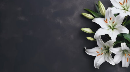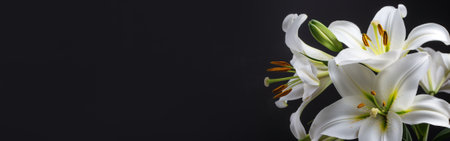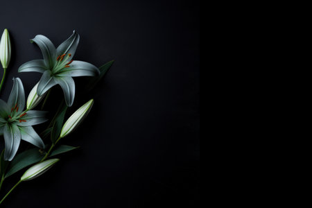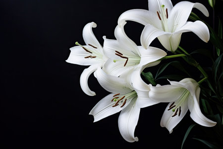 Elegant white lilies on a stark black background with ample copy space, perfect for greeting cards and spring themed designs