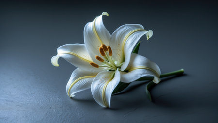 Close-up of a white lily flower with soft, curved petals and vibrant yellow stamens, placed on a dark textured surface. Elegant and serene composition.