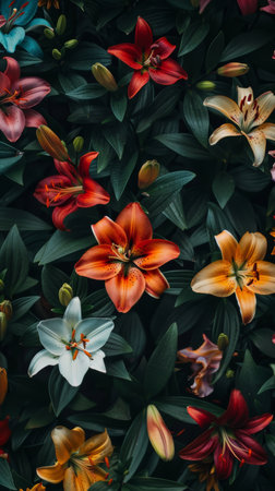 Colorful lilies amidst dark green foliage