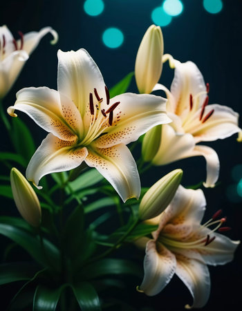 A cluster of white lilies is beautifully arranged, highlighting intricate patterns on petals. The dark background enhances their elegance and vibrancy, creating a striking composition. Generative AI.