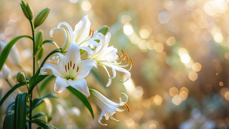 Delicate white lilies bloom gracefully in a sunlit garden during early morning hours