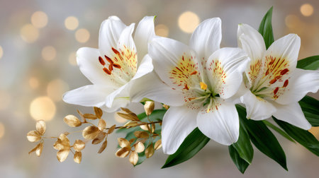 Beautiful white lilies arranged elegantly against a soft bokeh background, enhanced with shimmering gold glitter, perfect for creating a serene and inviting atmosphere.