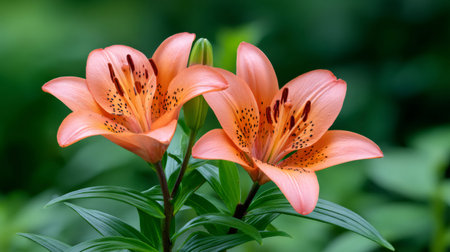 Orange lily flowers blossoming with green leaves against a soft background