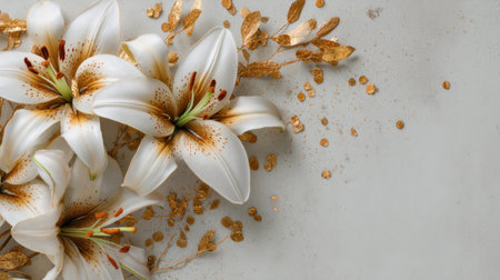A stunning arrangement of elegant white lilies with golden accents on a soft textured background, perfect for creative projects, floral designs, or seasonal themes.