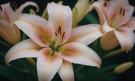 A stunning image of a cluster of delicate white lilies with droplets of water glistening on their petals, set against a dark background to enhance their elegance.