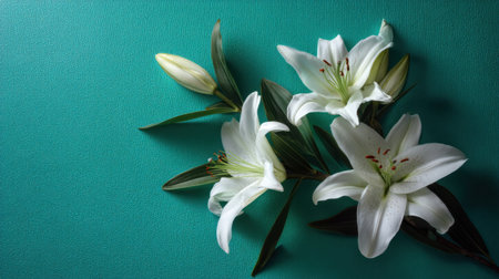A stunning arrangement of white lilies against a vibrant teal backdrop, perfect for floral decor, weddings, and nature-inspired projects.