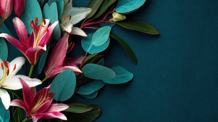 A stunning floral arrangement featuring pink lilies and lush green leaves set against a dark teal background, perfect for nature enthusiasts and design projects.