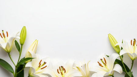 White lilies with green stems and buds are arranged on a clean white background, offering ample copy space.