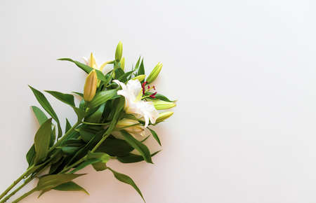 White lily buds on white background with copy space suitable for various occasions. Concept Floral Photography, Lily Blooms, White Background, Copy Space, Versatile Imagery