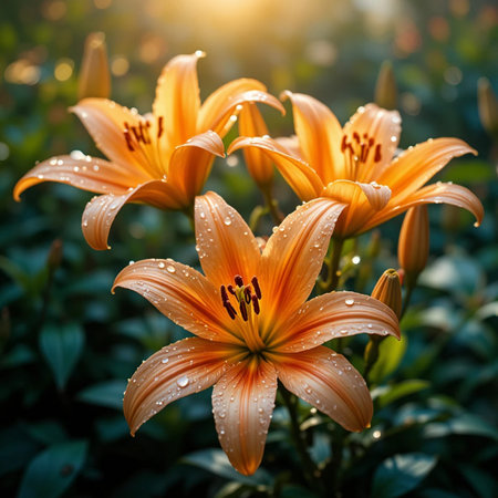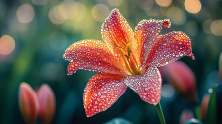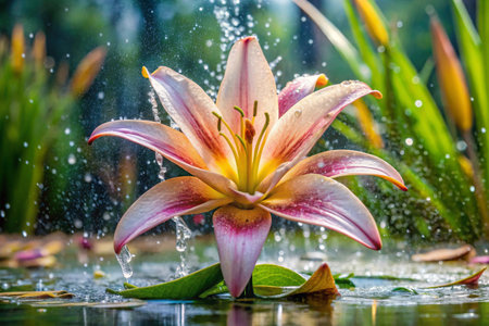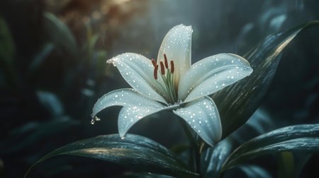 A delicate lily with droplets of water on its petals, reflecting light and color, surrounded by lush green leaves, creating a beautiful nature composition