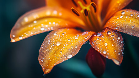 A flower with dew drops on its petals against a dark background, with the droplets reflecting light and adding a sense of depth and richness to the image.