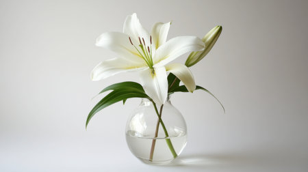 A beautiful white lily displayed in a simple glass vase, showcasing natural elegance and tranquility, perfect for interior decor with a fresh and clean aesthetic.