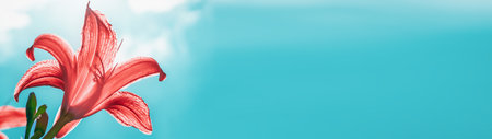Garden lily flower in backlit sun on a sky background banner panoramic.