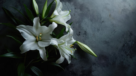 Find solace in the serene beauty of white lilies set against a dark gray background, symbolizing peace and remembrance in times of mourning. This floral arrangement offers a quiet tribute to the departed, providing comfort and support to those grieving their loss.