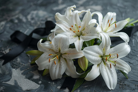 Featuring a white lilies on a grey background with black ribbon