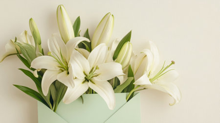 White lilies in a pale green envelope on a light cream background, classic and elegant generative ai
