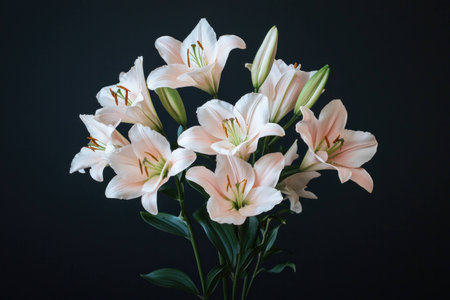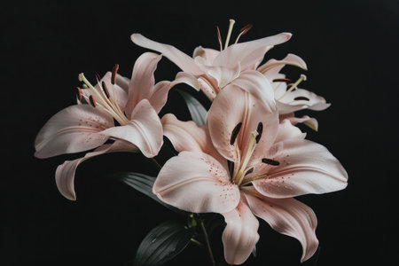 Delicate pink lilies arranged beautifully against a dark background, showcasing elegance and natural beauty. Ideal for floral arrangements or nature-themed projects.