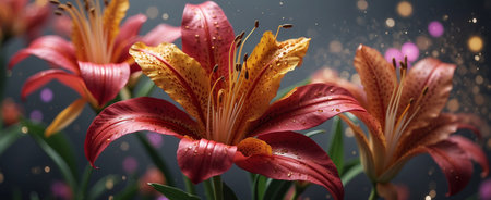 A close-up captures a blooming lily, showcasing vivid colors across its petals and leaves. The composition highlights the flower against a stark black backdrop. Its style presents a high contrast. Ideal for illustrating themes of beauty, nature, or artistic design, it is suitable for various commercial or decorative applications.
