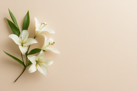 Delicate white lilies with green leaves against a soft beige background.