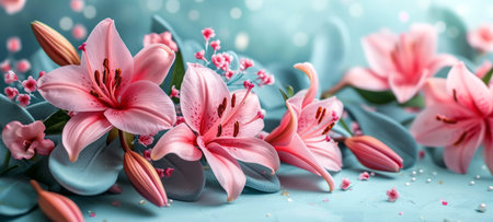 Wide banner with pink lilies and small flowers on a blue backdrop, suitable for decorative prints, spa environments, or floral-themed websites.