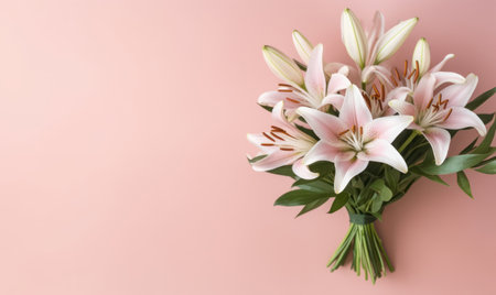 Delicate white lilies on a soft pink background, showing a mix of open blooms and closed buds. AI Generative