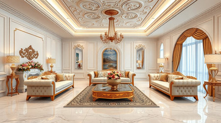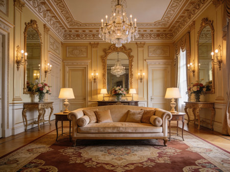 rich apartment interior with golden baroque decorations on the walls and luxury furniture. the room is flooded with the rays of the setting sun