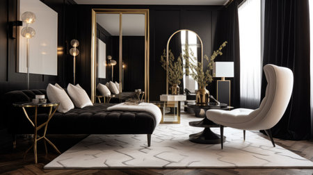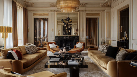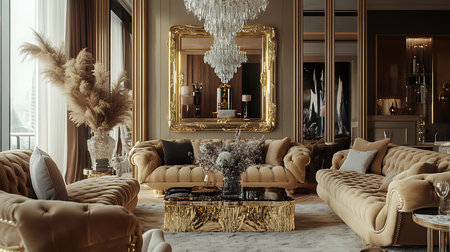 Bright and elegant living room featuring stylish furniture, gold accents, and reflective surfaces, creating a cozy and luxurious atmosphere perfect for relaxation and entertaining.