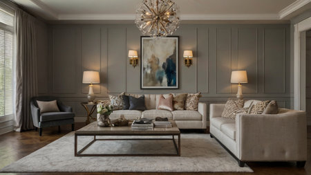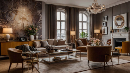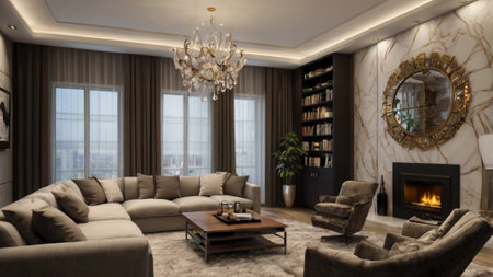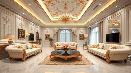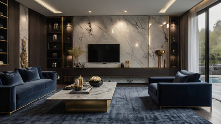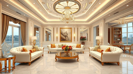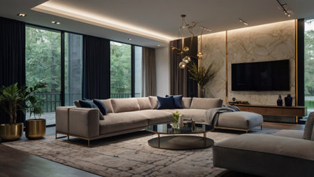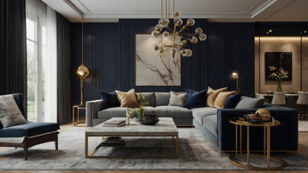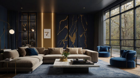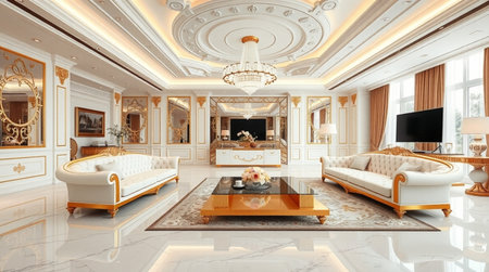 Luxury living room interior design with sofa and coffee table.