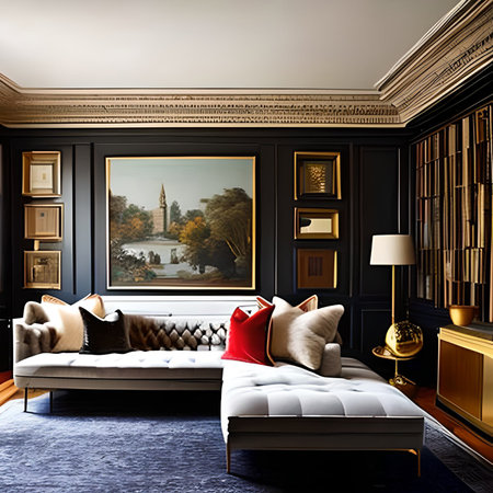 Luxury living room interior design with sofa, coffee table and paintings