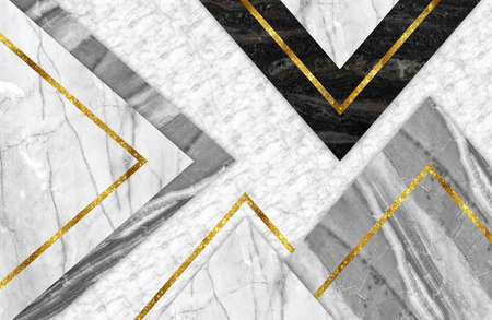 3d abstract marble wallpaper for interior home decor. golden, white, black, white and gray triangles marble background
