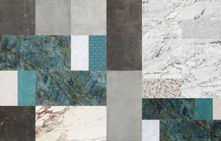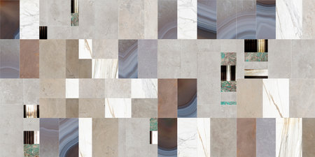 Creative patchwork pattern mixed of several marbles and stones, with arches and decoration for wallpaper, floor, wall, home and digital use.