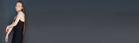 young and stylish woman in dark strap dress on black background, banner