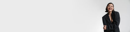 brunette asian woman in trendy suit standing with hands on hips on white, banner