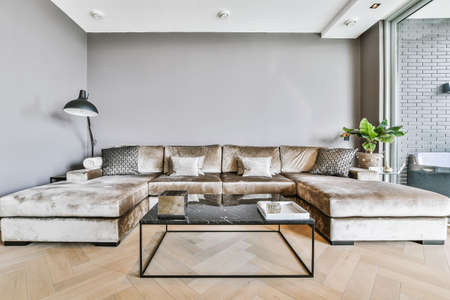 Stylish and cozy living room with soft decorative huge sofa