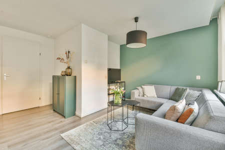 Interior of bright living room with stylish furniture