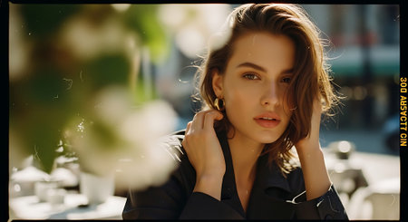 A stylish woman with long hair, wearing a black and white jacket, standing in a city street with blurred urban background