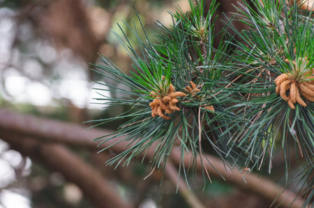 Pine tree in bloom. Mediterranean Pine tree with long needles and flowers in springtime