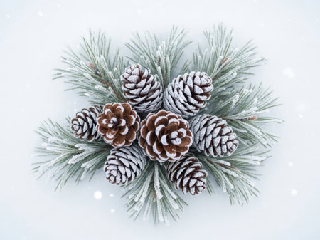 Detailed view of a pine branch showcasing frost and pine cones, set against a soft blurred backdrop, highlighting natural beauty and texture. Greeting card, copy space