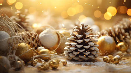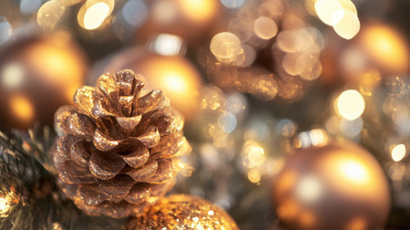 A close-up of golden Christmas ornaments and a pine cone against a soft, glittering bokeh background, evoking a festive and luxurious holiday atmosphere.