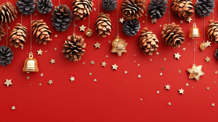 A stunning arrangement of pinecones and festive decorations suspended against a bold red background, perfect for capturing the spirit of holiday festivities and warmth.