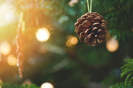 Beautiful New Year decorations sparkle as sunlight filters through pine branches creating a warm and enchanting atmosphere at dusk.