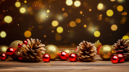 Decorated in New Year's style Christmas yellow and red balls, and natural pine cones on wooden table. Golden shining festive bokeh on dark yellow background with copy space for text.
