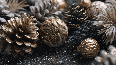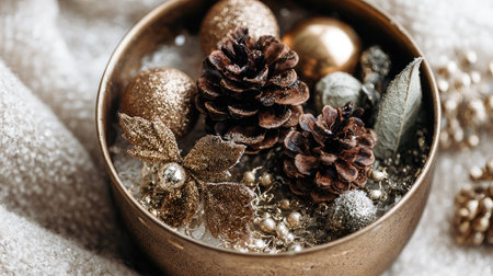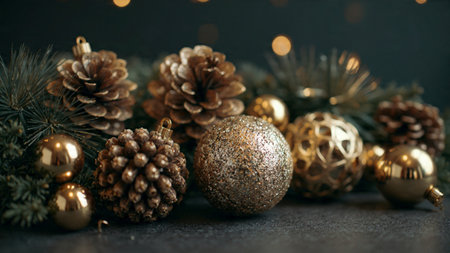This captivating image features a blend of elegant holiday decorations, including glittering ornaments and natural pine cones, creating a festive atmosphere.
