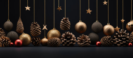 Christmas and New Year decoration with pine cones and golden balls on black background