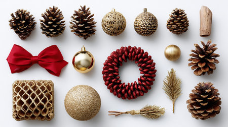 A beautifully arranged flat lay of festive decorations featuring pinecones, ornaments, and greenery. Ideal for holiday themes and seasonal decor.