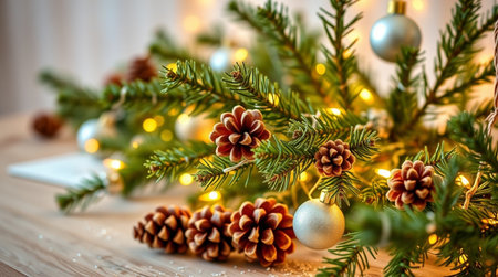 A close-up captures a decorated Christmas tree with pine cones and small lights. The composition is set against a soft, blurred background, highlighting the texture and details of the natural elements. This image is suitable for festive season content, editorial illustrations, and commercial design purposes.