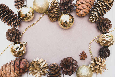 The frame is made of golden Christmas balls, cedar, pine and spruce cones. Festive composition in warm colors with place for text.